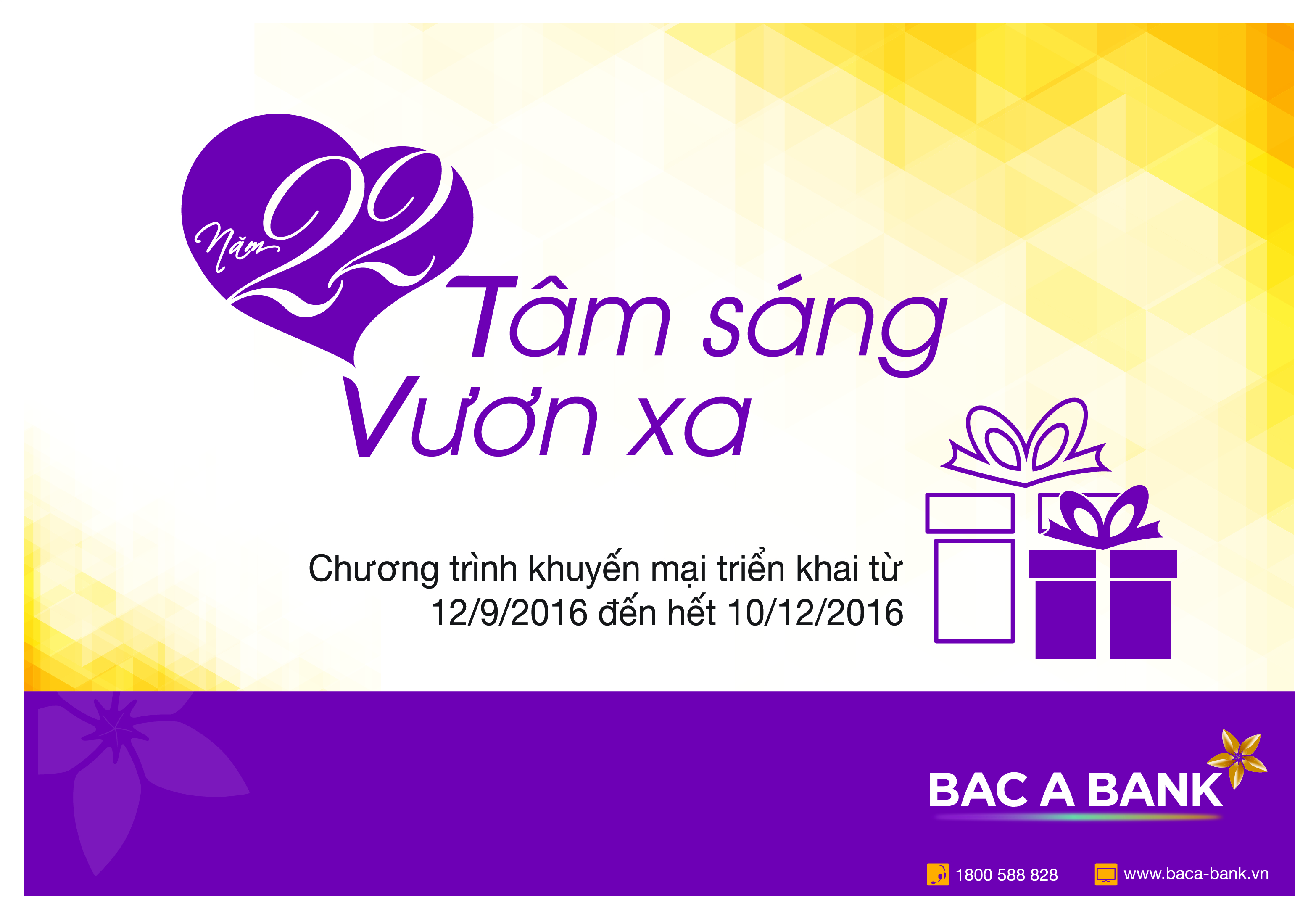 Kỉ niệm 22 năm thành lập (17/09/1994 - 17/09/2016), Ngân hàng TMCP Bắc Á (BAC A BANK) thực hiện Chương trình khuyến mại “Tâm sáng vươn xa” thay lời cảm ơn sâu sắc gửi tới Quý khách hàng đã luôn dành trọn tin yêu cho BAC A BANK suốt nhiều năm qua.