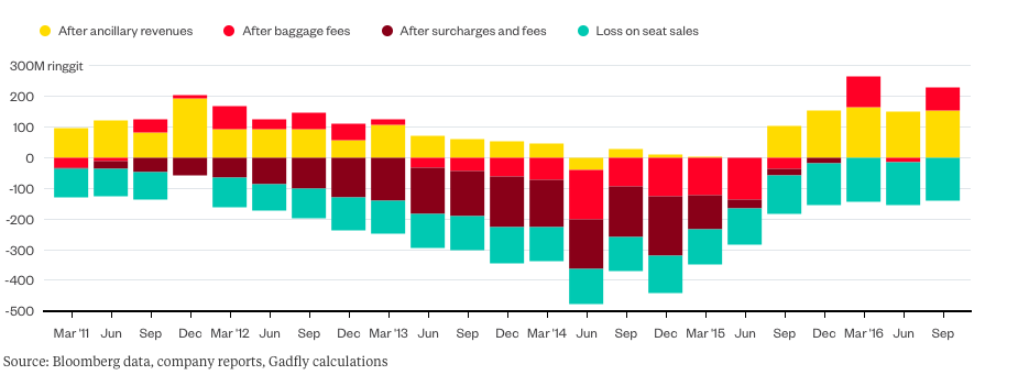 Vậy liệu có phải doanh thu từ phí gửi hành lý hay những loại phí khác giúp Airasia kiếm được tiền hay không? Không hẳn. Phần thu thêm được từ các loại phí như vậy chắc chắn sẽ giúp cải thiện bức tranh tổng thể nhưng thực tế là công ty này vẫn tuyên bố thua lỗ gần như toàn bộ và chỉ báo lãi 3 quý duy nhất trong suốt 5 năm qua.