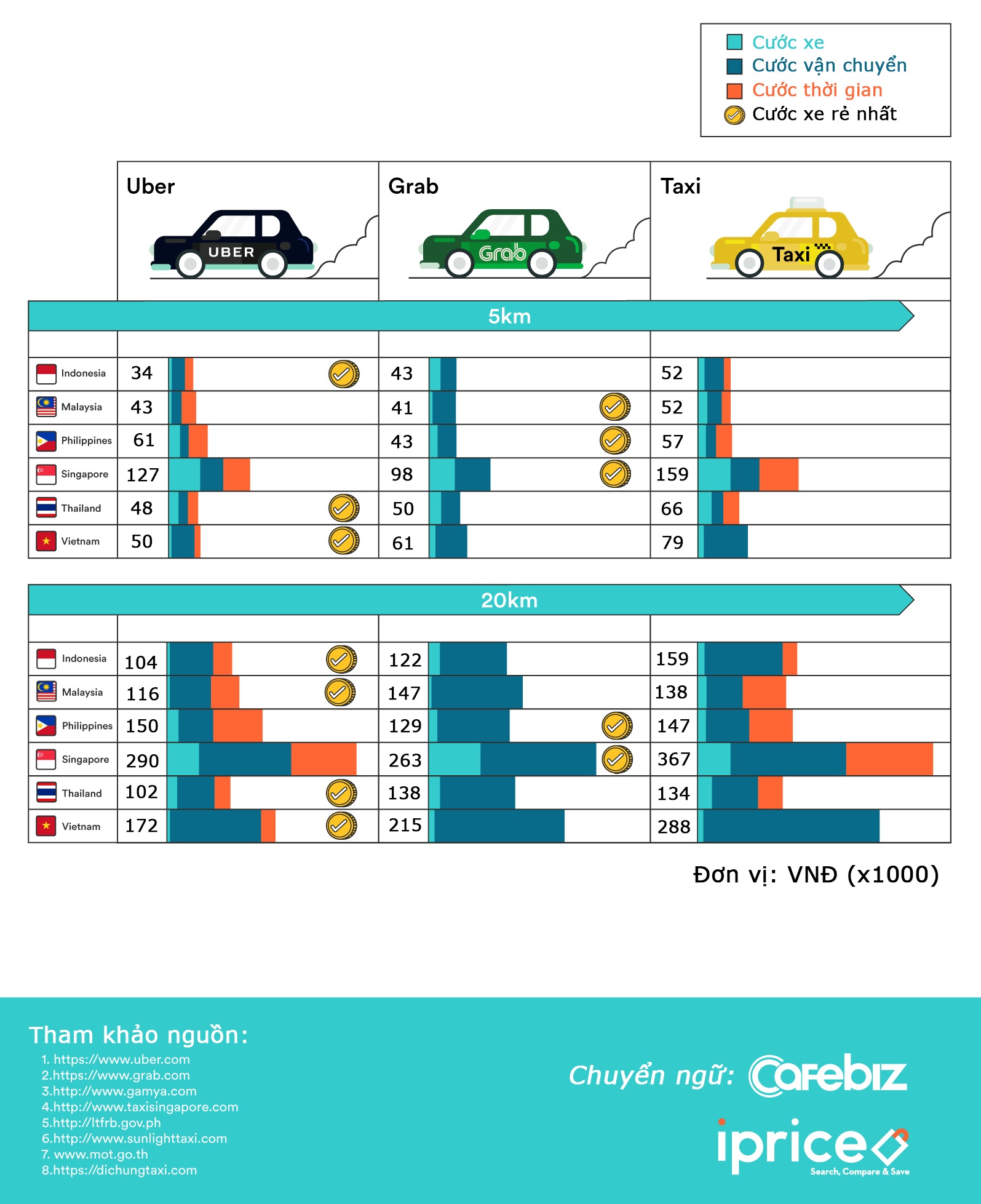 - Việt Nam là quốc gia có chi phí taxi, Uber hay Grab đắt gần nhất khu vực Đông Nam Á, chỉ rẻ hơn mỗi Singapore, đắt hơn các nước còn lại là Thái Lan, Malaysia, Indonesia...